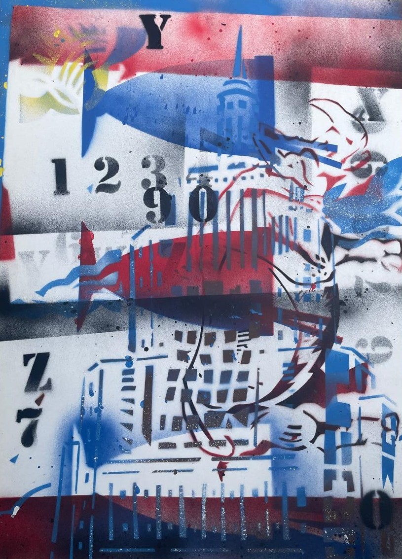 A máscara, ou stencil, é recortada com temas variados, mas o uso da tinta spray é sempre com a preocupação da textura, da cor e transparência.
